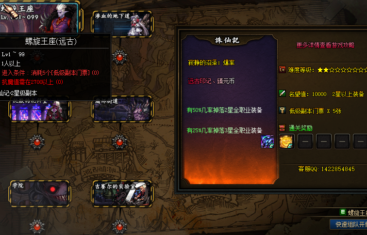 副本掉落“初级副本门票”“远古符石”“臻元币”有30%几率掉落“1星全职业装备”